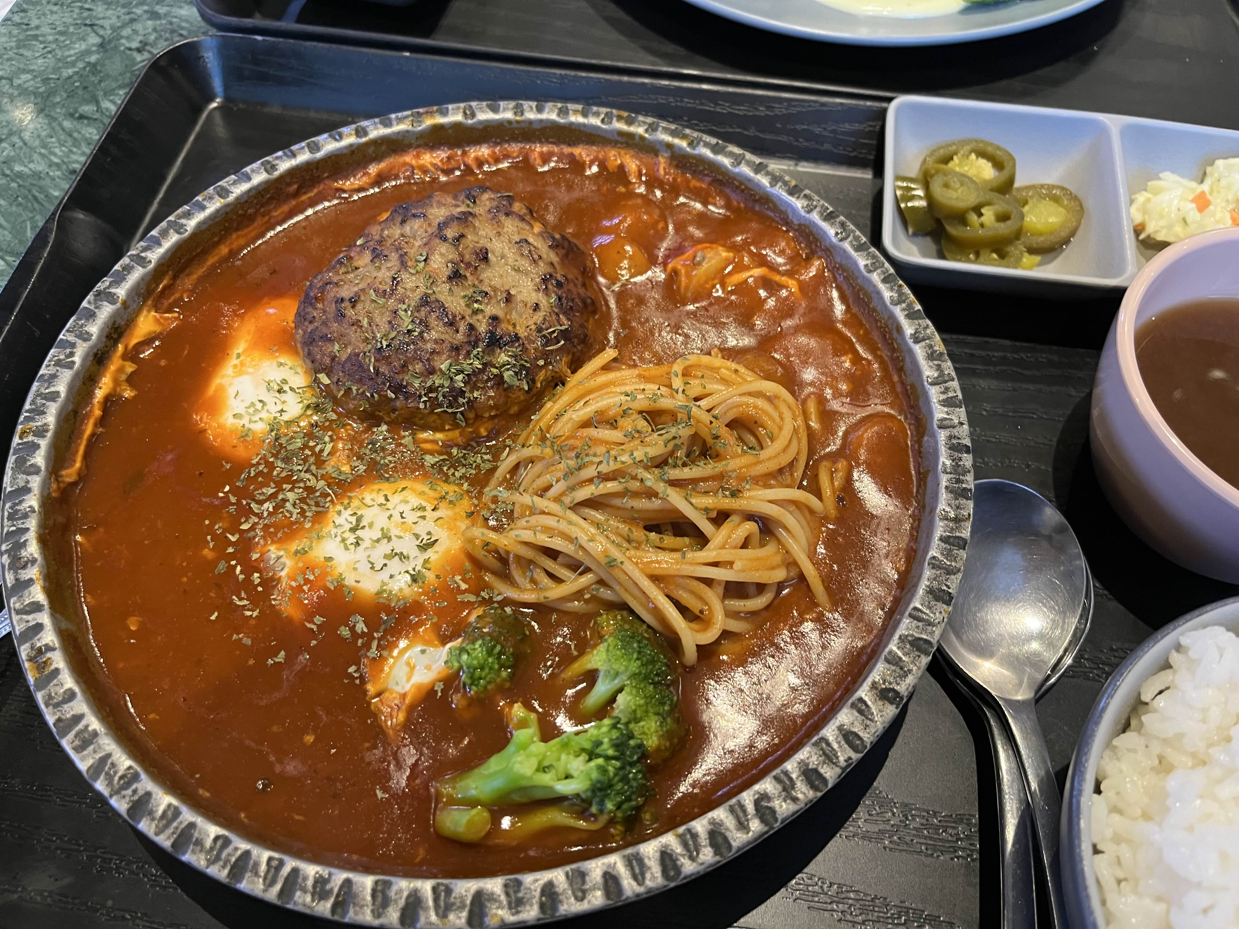 쇼핑하고 구경하다 보니 배가 고파서 모모스테이크에서 에그인헬함박&파스타