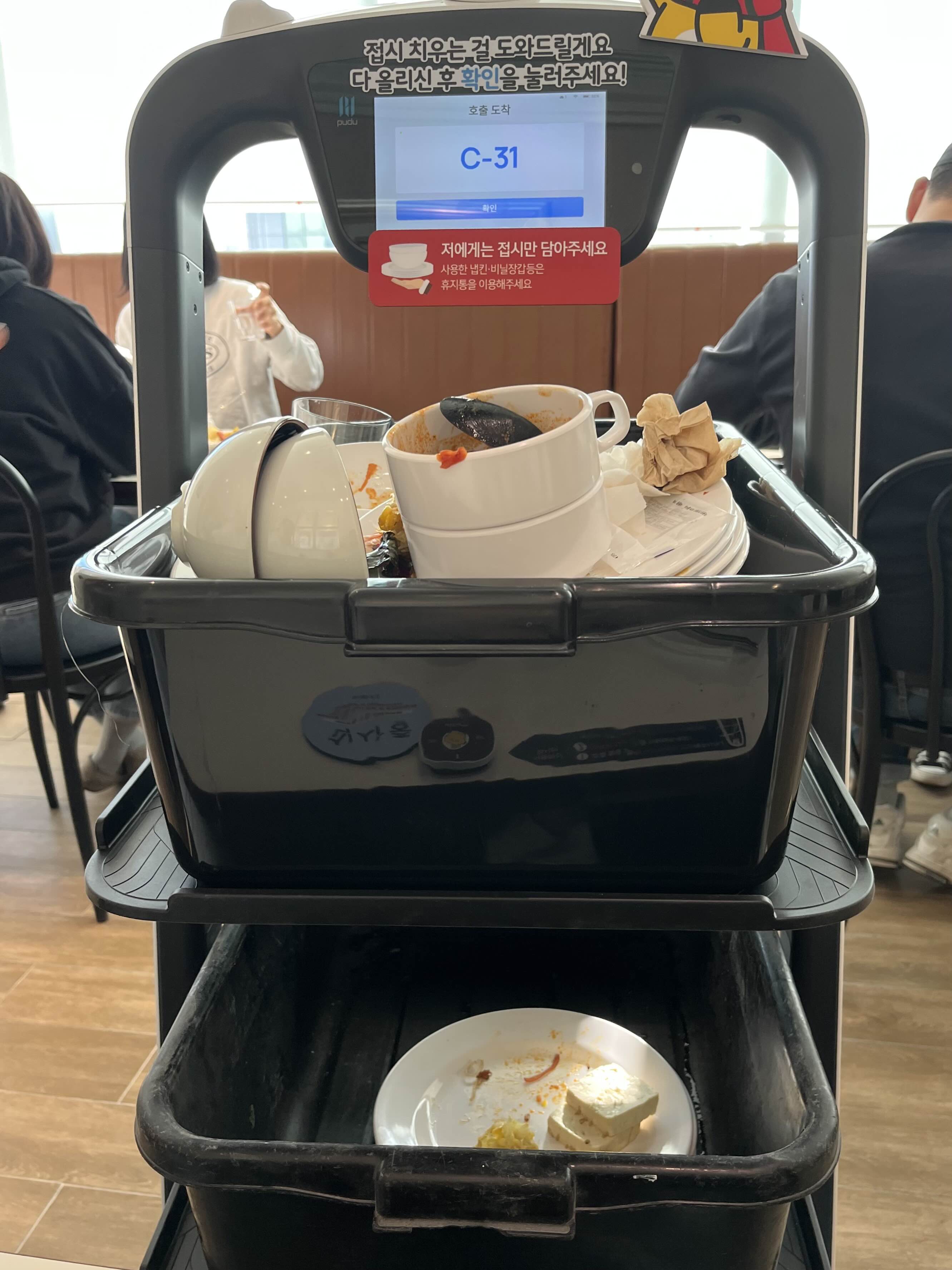 푸두봇에 빈접시를 넣으면 된다. 직원들이 빈접시를 수거 해야 하는 수고는 덜었지만….